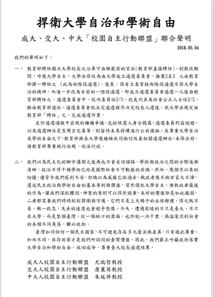 【全國教育產業總工會】支持由台大、成大、交大、中大所提出之「捍衛大學自治及學術自由」聲明,在99週年「五四運動」的今天,抗議教育部粗暴無理的拔管行為。民國8年由青年學生們所發起之「五四運動」,其後引發了一連串文化新改革,其中對於「民主」與「科學」的追求,被認定是使中華民國邁向民主國家、現代化國家重要的里程碑。時至今日,號稱「民主進步」的政府卻走回頭路,用如此不合理的手段傷害大學民主,難道大學校園只能為政治服務?教育部不要忘了其主管事務是全國教育,其所樹立的應是教育典範。將政治黑手伸進校園,是使教育價值、民主價值崩毁。