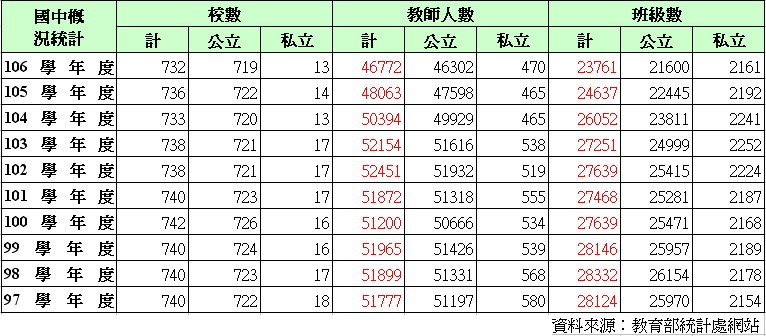 察教育部統計處網站會發現到一個很有趣的現象,從97到106學年度,國中班級數與教師人數(見附表)從來沒達到教育部現行所規定每班配2.0個員額。也就是說,教育部自己規定的辦法從未實現。每年放任各縣市超額教師四處流浪,讓學生、家長、教師人心浮動不安,這難道是教育部應有的態度?