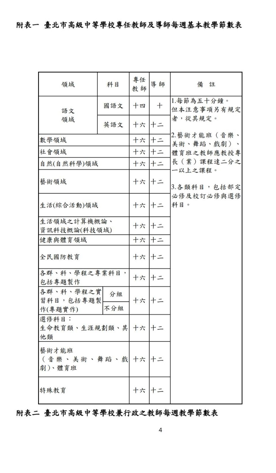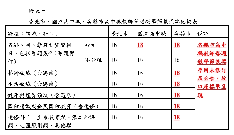 比較臺北市、國立高中職、各縣市教師每週教學節數標準(或稱教師每週教學節數注意事項),如附表一,可以清楚發現,自8月1日起,臺北市真正做到【科科等值】,所有科目的教師,除國文科每週14節外,其他各科教師每週16節,包括高職實習課任課教師在內!但國立高中職之高職實習課任課教師每週18節,明顯被特別歧視!另外,除臺北市及國立高中職之各縣市高中職教師,甚至連藝術領域、生活領域、健康與體育領域(音樂、美術、體育…)之教學節數,因為各縣市未修訂及公告教學節數標準調降,所以至今到底是維持每週18節,還是調整為每週16節,莫衷一是,要學校及教師如何遵循?