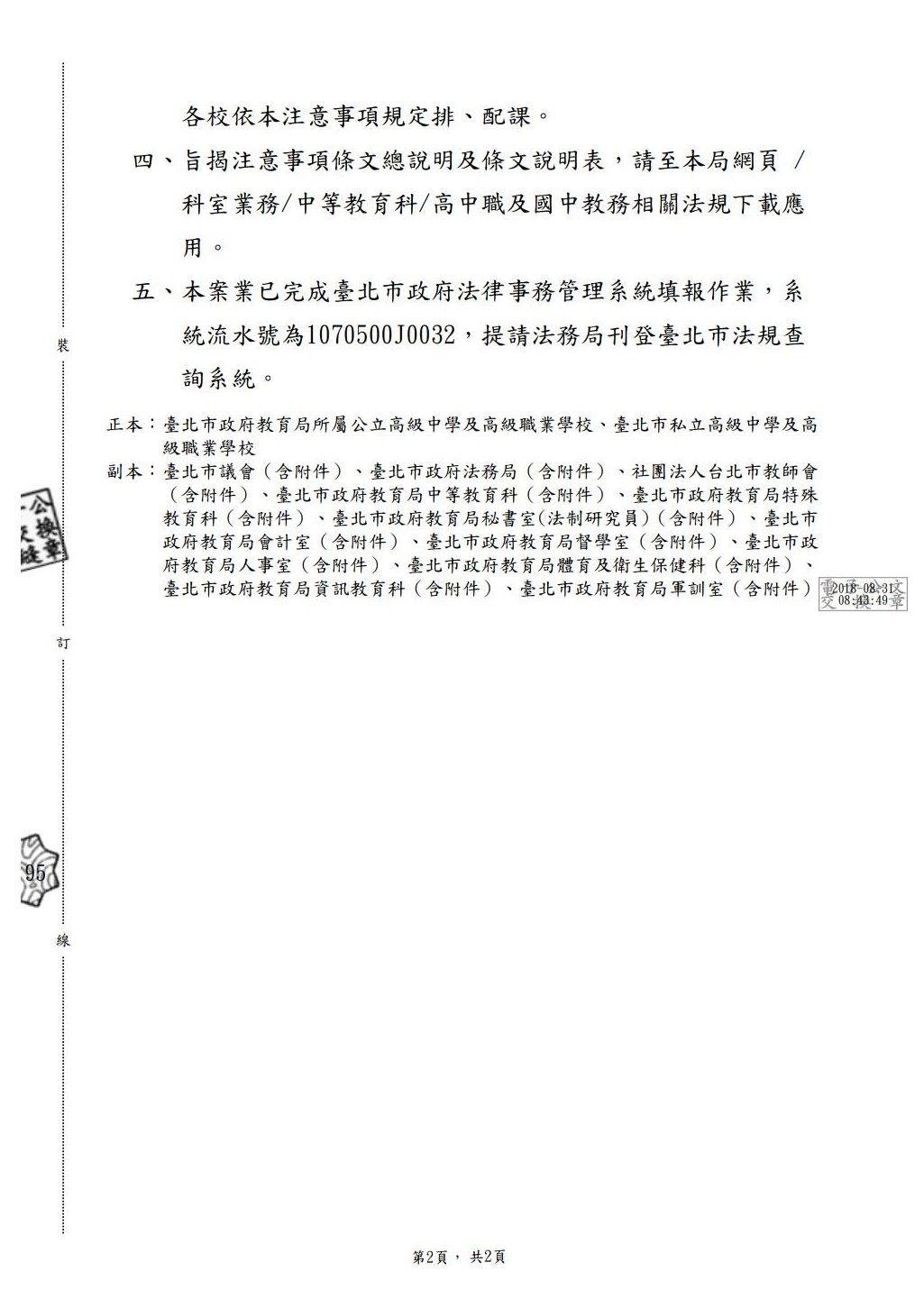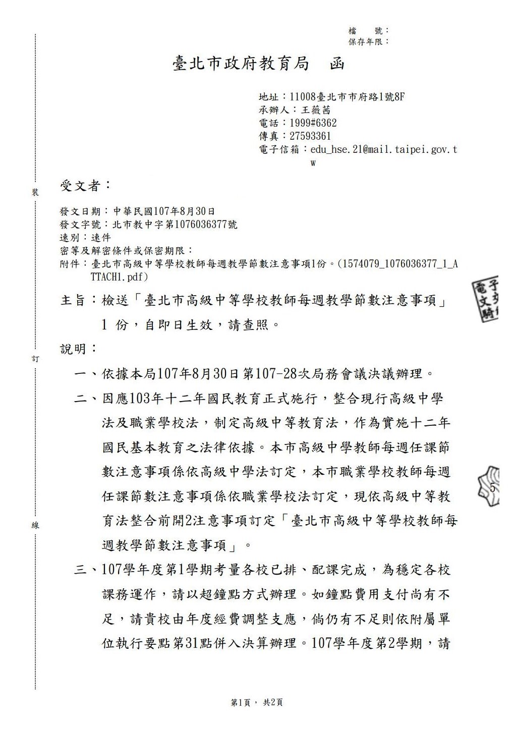 107年8月30日,臺北市政府教育局便函文所屬各高級中等學校,並載明「各群、科、學程之實習科目,包括專題製作(實作)」老師其教學節數降至16節,但綜觀其他縣市之技術型高中之實習科目教師,其教學節數仍維持在18節,造成嚴重的不公平現象。難道臺北市的老師與其他縣市老師教授內容不同?此舉是使臺北市與其他縣市的落差更大,在面臨新課綱,其他縣市更無暇準備。