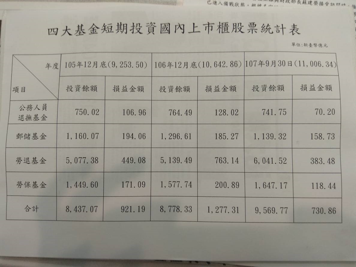 2.我們也不想再問四大基金有沒有護盤?因為我們也知道銓敘部的標準答案,一定是:「沒有護盤!退撫基金的投資是以長期獲利為考量,逢低並擇優進場投資,以獲取更高收益。」所以我們疑惑、提問的是:「84年以來台股只有5年曾經上萬點,而台股今年萬點以來四大基金卻還不斷越買越多,這符合『逢低進場』,中長期投資規劃策略嗎?」(四大基金2017年12月底在國內上市櫃股票投資餘額為8,778億元,到今年7月底投資餘額增至9,295億元,9月底更是攀升至9,570億元。』(附件2)。是否也因干擾未正常調節導致勞動基金、國保基金及退撫基金,三大基金合計9月單月虧損265.86億元!?