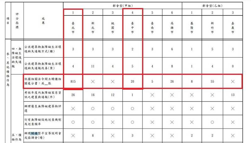 雖然都發局表示,為改善騎樓學童及行人通行安全,實施騎樓安學計畫會函請各局處提供建議路段再來統整,作為當年度優先辦理路段評估。但是依據110年公共建築物無障礙生活環境及騎樓整平示範計畫業務督導考核【成果報告】顯示,臺北市政府共開出了815張騎樓相關處分書,臺中市政府則開出了20張,臺中市政府是否執行不力呢?