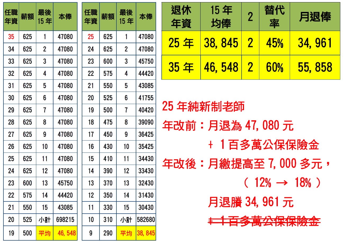 附表:年金改革後現職教師月退俸試算(任職35、任職25年)