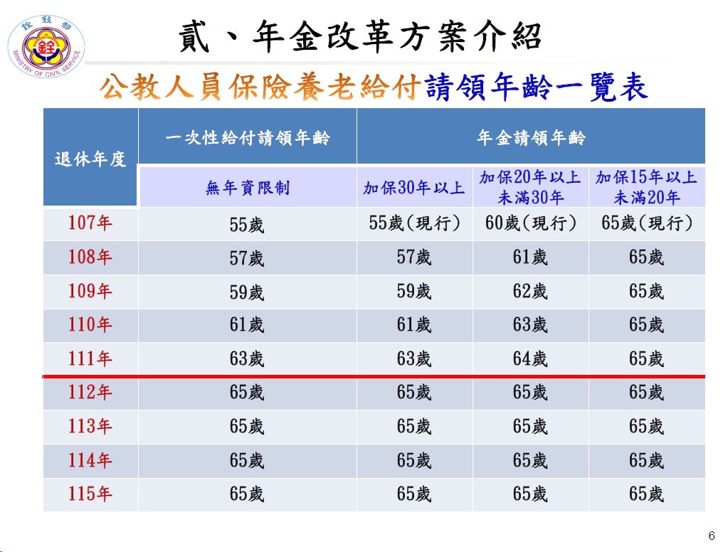 然銓敘部公告之方案草案,公保養老一次性給付之請領年齡,自民國107年開始將逐年遞增,到民國112年退休之公教人員,都必須等到65歲才能領取公保養老一次性給付。此一政策極為荒謬,何以公保養老一次性給付在退休時不能即時領取,要65歲才可領取?請政府說清楚講明白!