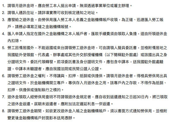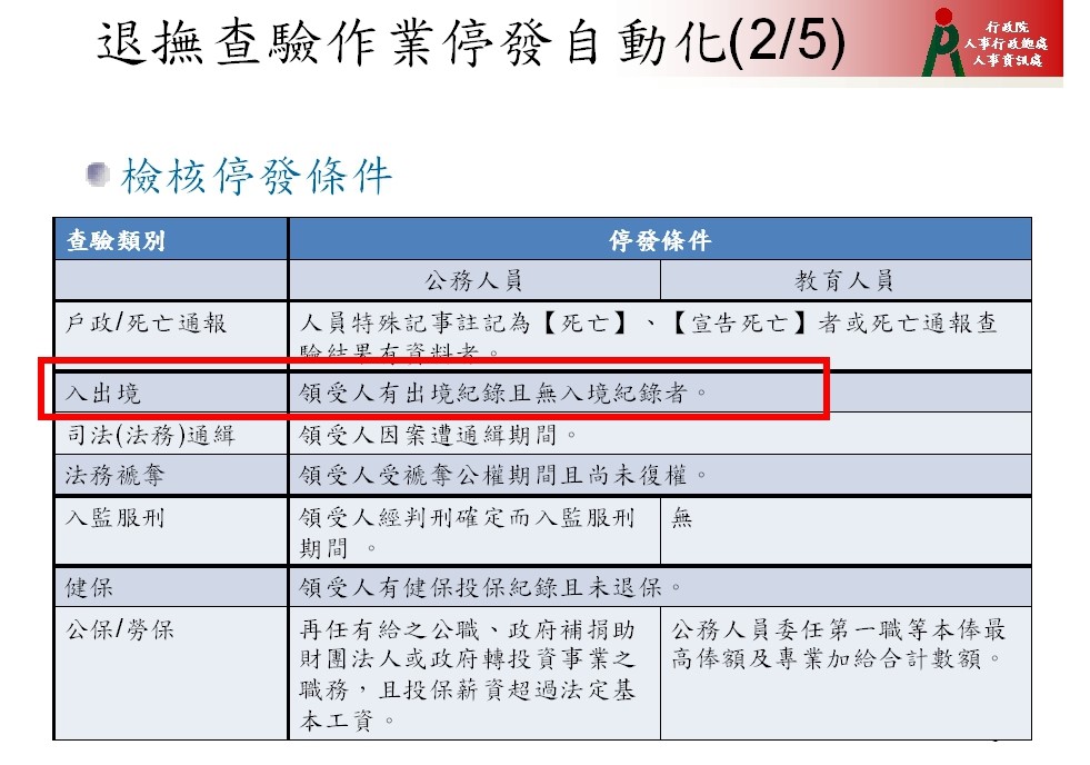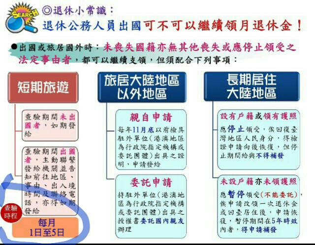 銓敘部退撫司於106年7月12日在網站上公告了〈公教人員退撫給與發放法制與實務〉,在辦法中第肆條〈赴大陸地區及其他地區之停止與暫停〉中詳列,公教人員退休金因在106年4月7日修改了退休金請領由半年發給改為按月發給。因此,公教人員退休後如果要出國者,必須配合政府不得於查驗時間內出國(每月1日至5日),如須在查驗期間出國,則必須主動聯繫發給機關,並詳細告知該機關前往地區、出入境時間、聯絡電話等等;如旅居大陸以外國家者,應於每年11月至主管機關親自申請;如長期居住大陸地區並領有護照者,則不予發給退休金;沒有護照未設戶籍者,則不得超出五年期限。