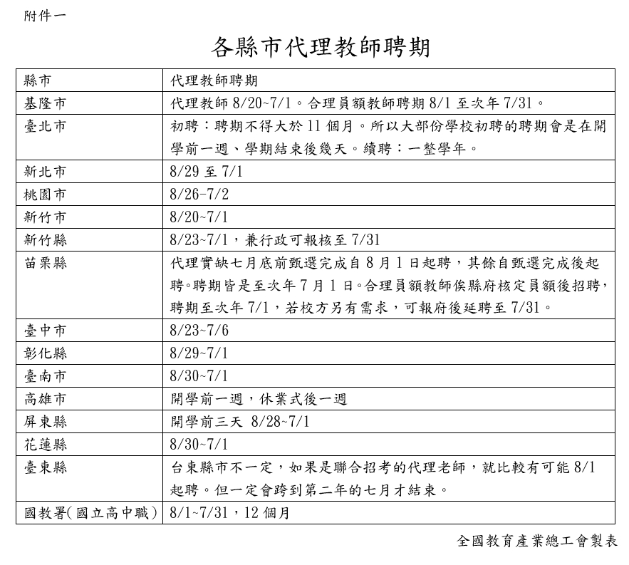 各校為了因應少子化,即使有教師退休,因擔心會有超額教師問題,不敢徵聘正式專任教師;加上高中職新課綱即將上路,對於未來選修課程仍充滿許多不確定性。從高中職到國小無不勒緊褲帶,教師出缺則以聘代理教師為主;加上行政工作繁忙,到了暑假行政職務仍無法確定,於是什麼科哪些課會出缺,往往到了開學前才能確知。而代理教師的薪資在各縣市財源考量之下,往往僅給10個多月的薪資,造成代理教師權益受損,出缺學校甄聘不到教師。即使教育部三申五令,但各縣市卻仍以省錢為最大考量。【全國教育產業總工會】收集各縣市代理教師聘期(如附件一)後發現,除了國教署所轄國立高中職外,全國各縣市聘任代理教師的聘期都是每年8月底到隔年7月初,甚至臺南市、花蓮縣是開學當天才起聘,如此,代理教師的薪資就整整少了快2個月,也難怪各校會甄聘不到教師。加上幾乎所有縣市都不採計職前年資,所以代理教師幾乎都是以初任教師的薪資計算!教育部於6月15日對於代理教師聘期召開記者會說明(如附件二),建議各地方政府對於代理教師聘期能朝聘至隔年7月31日之方向規劃辦理,但從實際情形看,顯然沒有達到,代理教師依舊血汗。