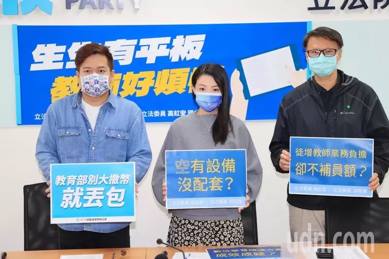 台灣民眾黨立委高虹安、邱臣遠今天偕全國教育產業總工會理事長林碩杰、教育部資科司科長鄭凱仁舉行「生生有平板,教師好煩惱」記者會。