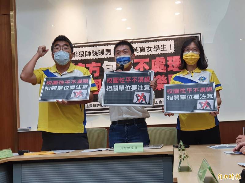 民進黨立委許智傑今與全國教育產業總工會、高雄市教育產業工會,針對高雄市傳出某高中職疑似出現隱匿「狼師」一事舉行記者會。