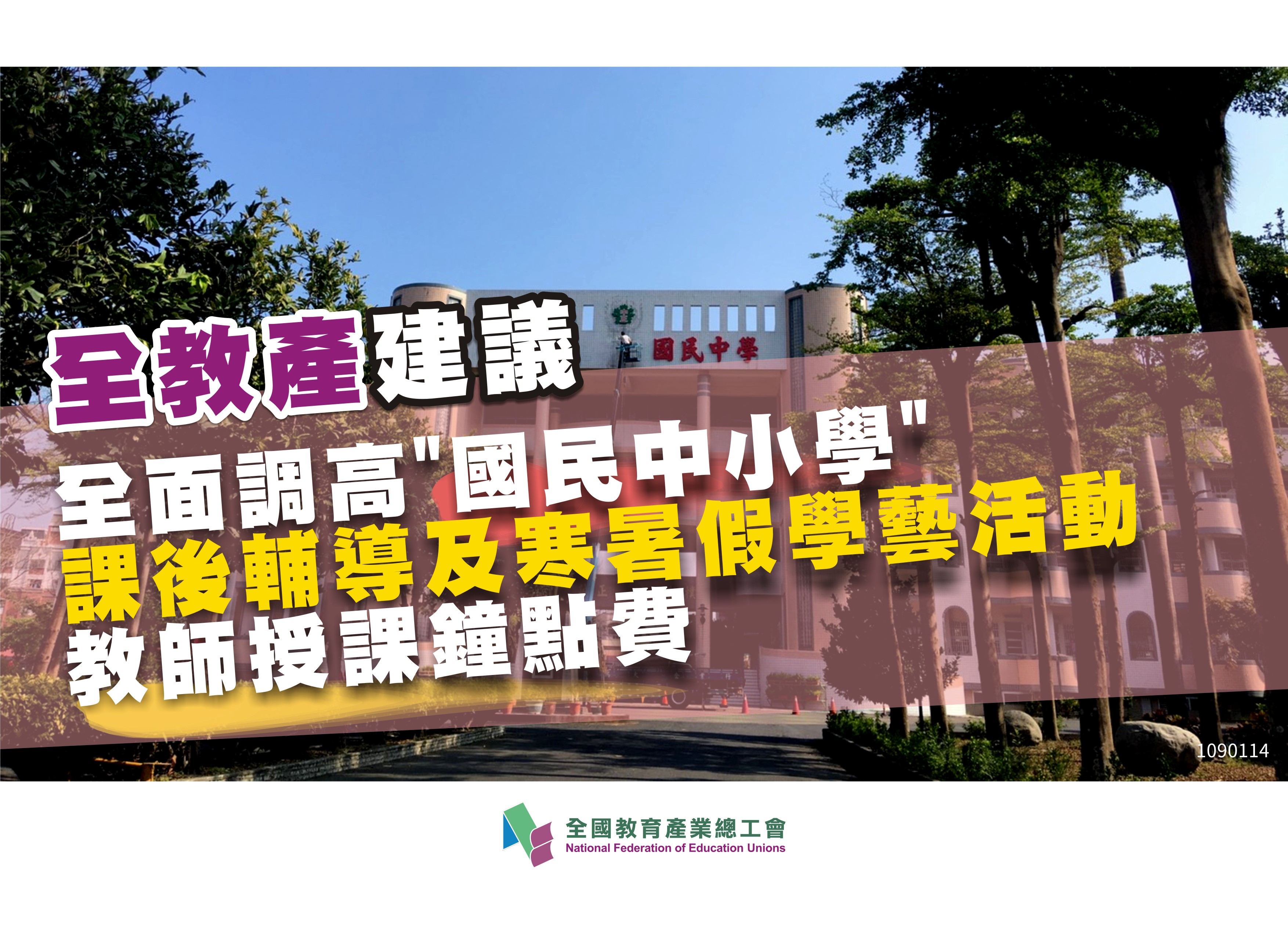 全國教育產業工會(以下簡稱全教產)表示,目前各縣市實施國民中學課後輔導及寒暑假學藝活動,授課教師鐘點費多年來皆為360-450之間;而高中職課後輔導鐘點費,則為450-550之間。國教署令各校自行訂之,因此高中職多將鐘點費訂在550元。相較之下,國中教師的課輔鐘點費則相對少。如按照高中職每節課50分鐘、教師鐘點費550來計算;國中教師授課一節45分鐘,理應有495(約500元)鐘點費。全教產建議,國中教師課後輔導及寒暑假學藝活動費用應按比例調高,以避免同工不同酬的情況。