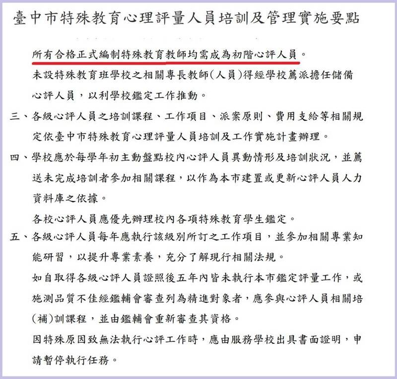 林碩杰表示,「台中市特殊教育心理評量人員培訓及管理實施要點」與教育部的參考原則明顯相牴觸,且拒絕增加經費聘任鑑定人力,竟將心評專業工作推給特教老師。