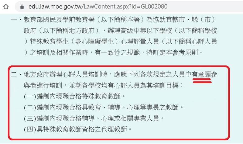 全教產理事長林碩杰表示,教育部國教署於6月發布「直轄市與縣市政府辦理高級中等以下學校特殊教育學生心理評量人員培訓及相關作業參考原則」,明文指出,地方政府辦理心評人員培訓時,應就各款規定人員中「有意願」參與者進行培訓,並朝各學校均有心評人員為其培訓目標,包括編制內現職合格特殊教育教師;編制內現職合格具教育、輔導、心理等專長之教師;編制內現職合格輔導、心理或相關專業人員;具特殊教育教師資格之代理教師。