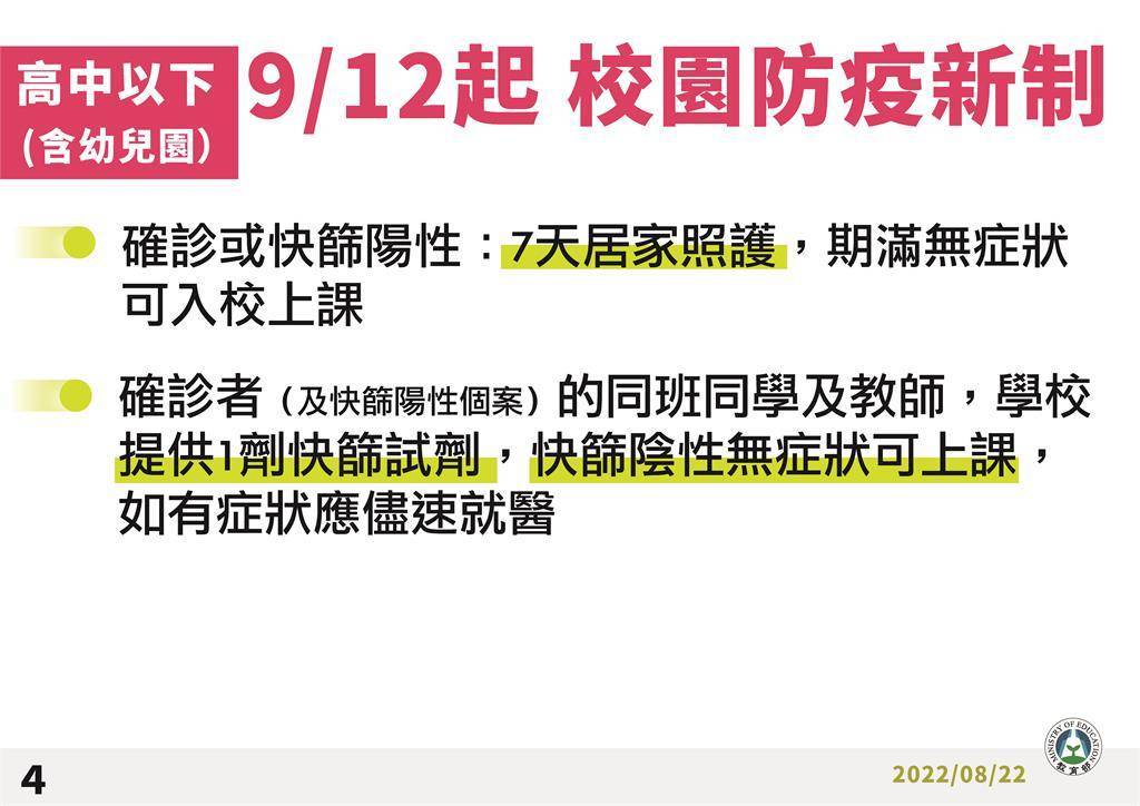 全國中小學於8月30日開學,教育部長潘文忠今宣布,中小學自9月12日起實施校園防疫新制,不再有全班停課,確診者同班同學及教師隔天快篩陰者照常上課。全教總憂心,目前規劃僅提供1劑快篩試劑,憂心病毒有潛伏期,快篩試劑不足;全教產則表示,開學前2週大量群聚,第3週新制上路時,疫情恐已炸開。