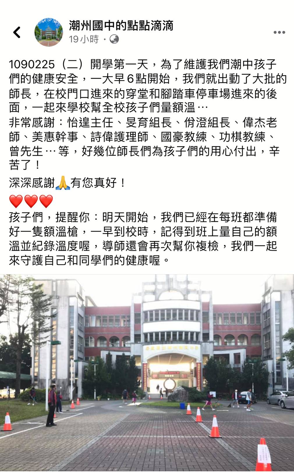 目前各醫院在前後門就設崗由專人測訪客額溫來防疫,而各個學校比照辦理由老師量測額溫,才能在第一時間檢測出發燒的學童。然而全教產為這些提早到校老師的安全感到憂心,建議政府應提供免費口罩或其他防護裝備予第一線的老師。