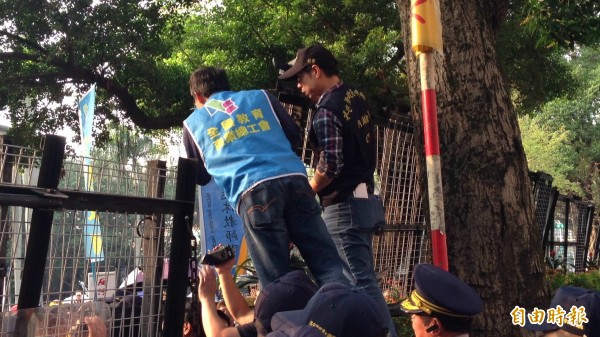 全國教育產業總工會等團體共上百名抗議民眾,今天下午企圖闖入教育部,全教產理事長黃耀南等人翻爬拒馬擬闖入。(記者林曉雲攝)