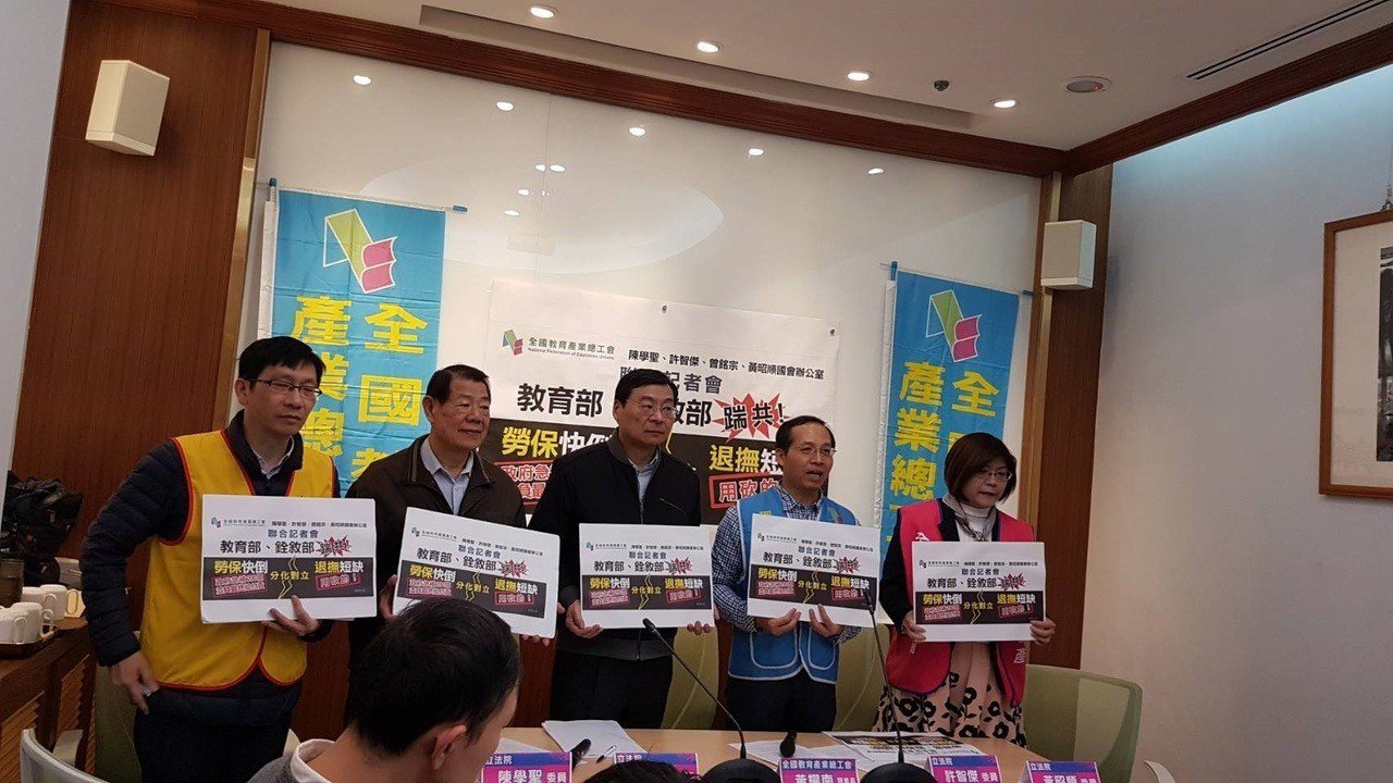 全教產今與朝野立委許智傑、曾銘宗、陳學聖等舉行記者會,高喊口號「該賺的錢要賺夠、該補的錢要補夠!」國民黨立委曾銘宗表示,蔡總統推動軍公教勞年金應一起改革,但軍公教去年7月實施,勞保卻在去年4月送立法院至今,不見改革決心,這次勞動部保證撥補200億元,根本是杯水車薪,呼籲蔡政府應有整體說明,撥補才有意義。陳學聖也批評,公教退撫基金延後破產,只是公教人員自己砍左手、補右手,呼籲政府該依法撥補。