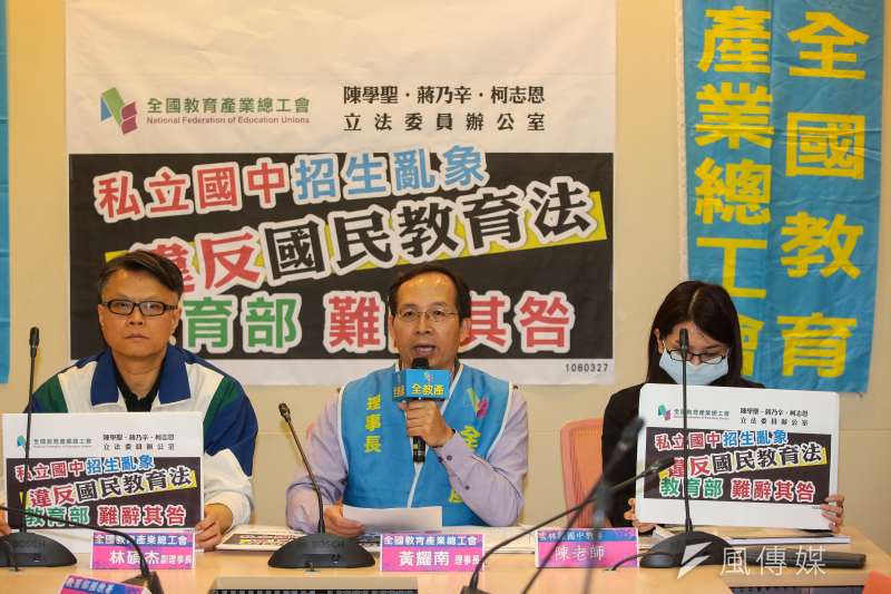 全國教育產業總工會理事長黃耀南表示,根據《國教法》第20條,私立國中應屬義務教育,不能進行所謂的招生考試,但現在各種名目都有,有的叫評量考試、小六基本學力檢測、國一新生多元能力競賽,甚至有叫所謂多元教育成長營、親子教育成長營來變相測驗,其中像台中衛道、明道、曉明幾所有名的學校,考試動輒1萬人參加,這些資訊都在網路上明白揭露,甚至入口網站上還有小六升國一的補習資訊流竄,但教育部就是什麼都沒看到,都說沒有違法招生。