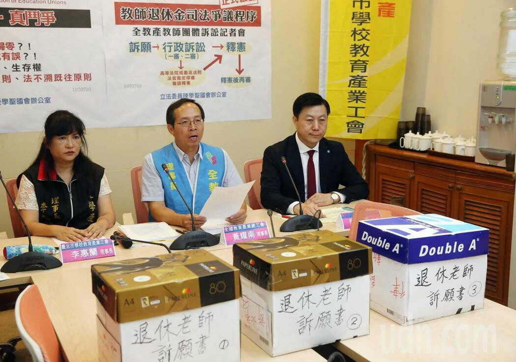 軍公教年改7月起正式上路,全國教育產業總工會理事長黃耀南今天上午舉行記者會,細數新法上路後亂象叢生,不僅優惠存款18%再上路第一天就被歸零,還有資深教師的退休金竟比資淺的還少。黃耀南宣告,全教產陪同全國15萬名退休教師進入司法爭議程序,從訴願開始,未來還有行政訴訟和釋憲,今天就是法律戰的開始。