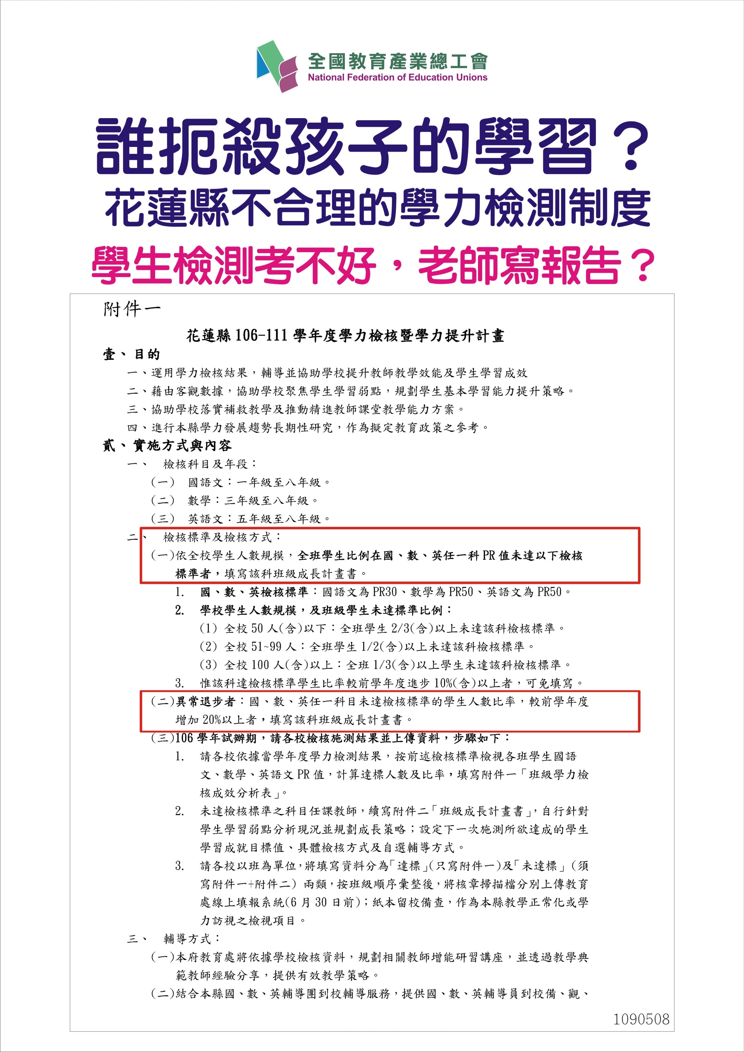 教育部於民國97年制定了《直轄市縣(市)政府辦理國民中小學學生能力評量檢測注意事項》,該事項規定,地方政府可以辦理國中小學生的能力檢核測驗,但能力檢測的實施,不應影響正常教學。然花蓮縣政府卻於106年逕自制定了《花蓮縣106-111學年度學力檢核暨學力提升計畫》,該辦法規定,依全校學生人數規模,全班學生比例在國、英、數任一科PR值未達標準者,需填寫該科班級成長計畫書,並應將檢核結果上傳。該班級之任課老師應該填寫「班級成長計畫書」,針對學生學習弱點分析現況,並規畫成長測略,也應設定下一次施測所欲達成的學生成就目標值。