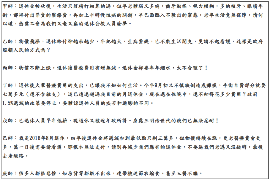 年改後,造成許多已退人員生活透支,我們收到了許多回信,在此舉若干例子如下: