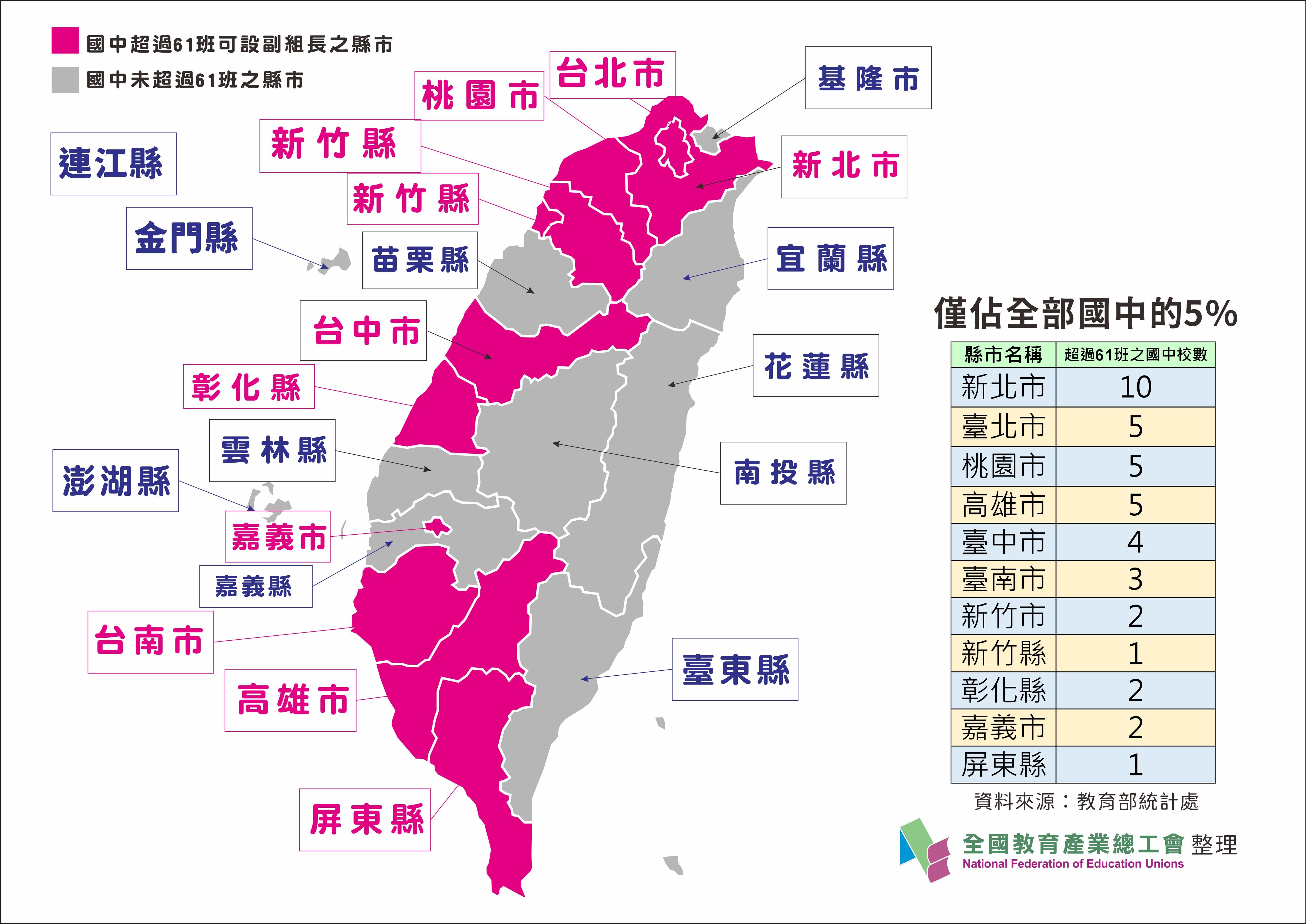 雖然,教育部《國民小學與國民中學班級編制及教職員員額編制準則》第7條雖開放各直轄市、縣(市)主管機關得就教職員員額編制,另定優於本準則之規定。但卻因大部分縣市怯於修法或尚未修法,所以也無法提供基層學校申請設置副組長一職;一整學年下來,教育部所提出的補助國中增置學務人力及副組長方案根本無法落實,有的縣市甚至主計及人事單位也不支持,教育部政策形同「喊假的」!