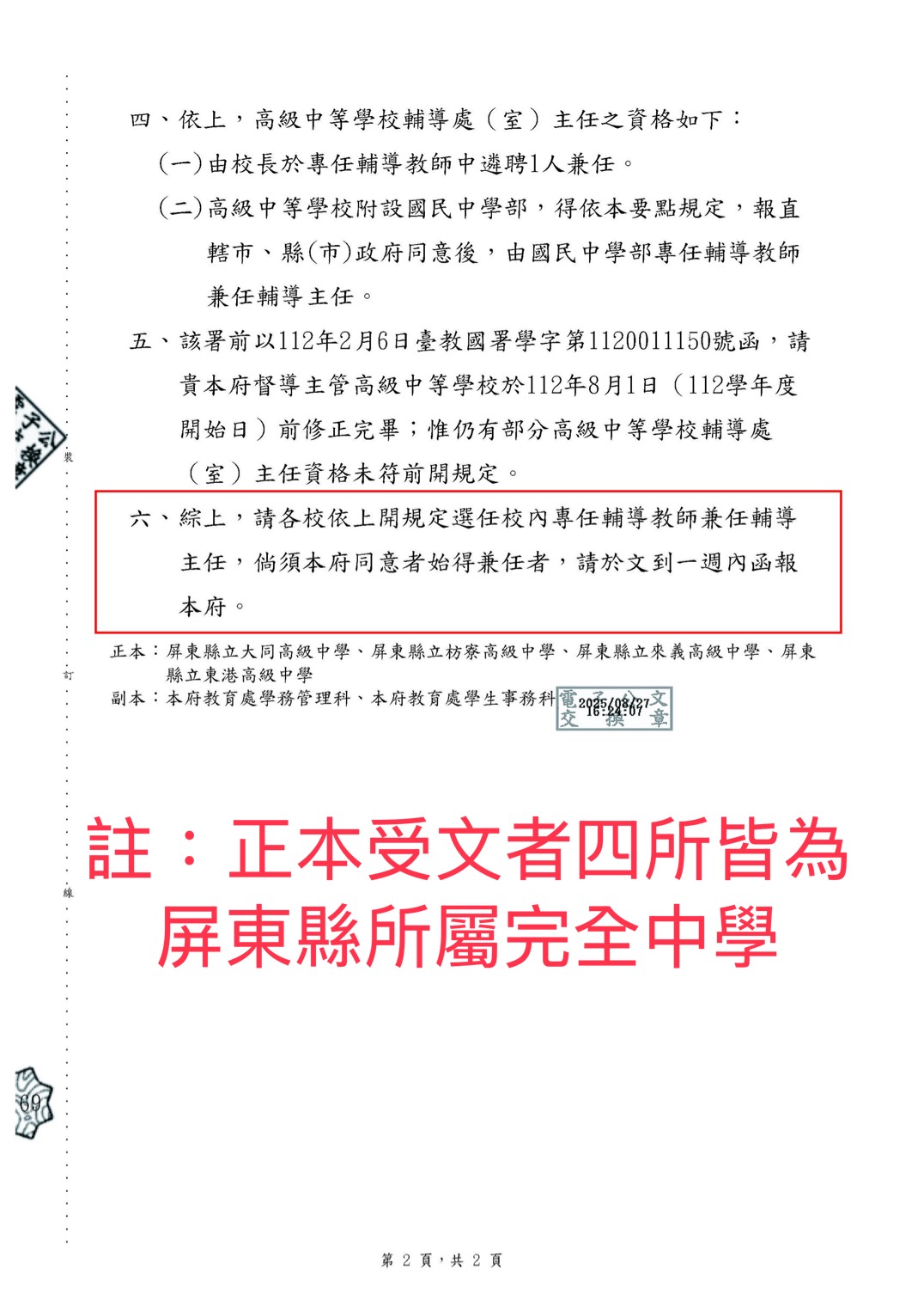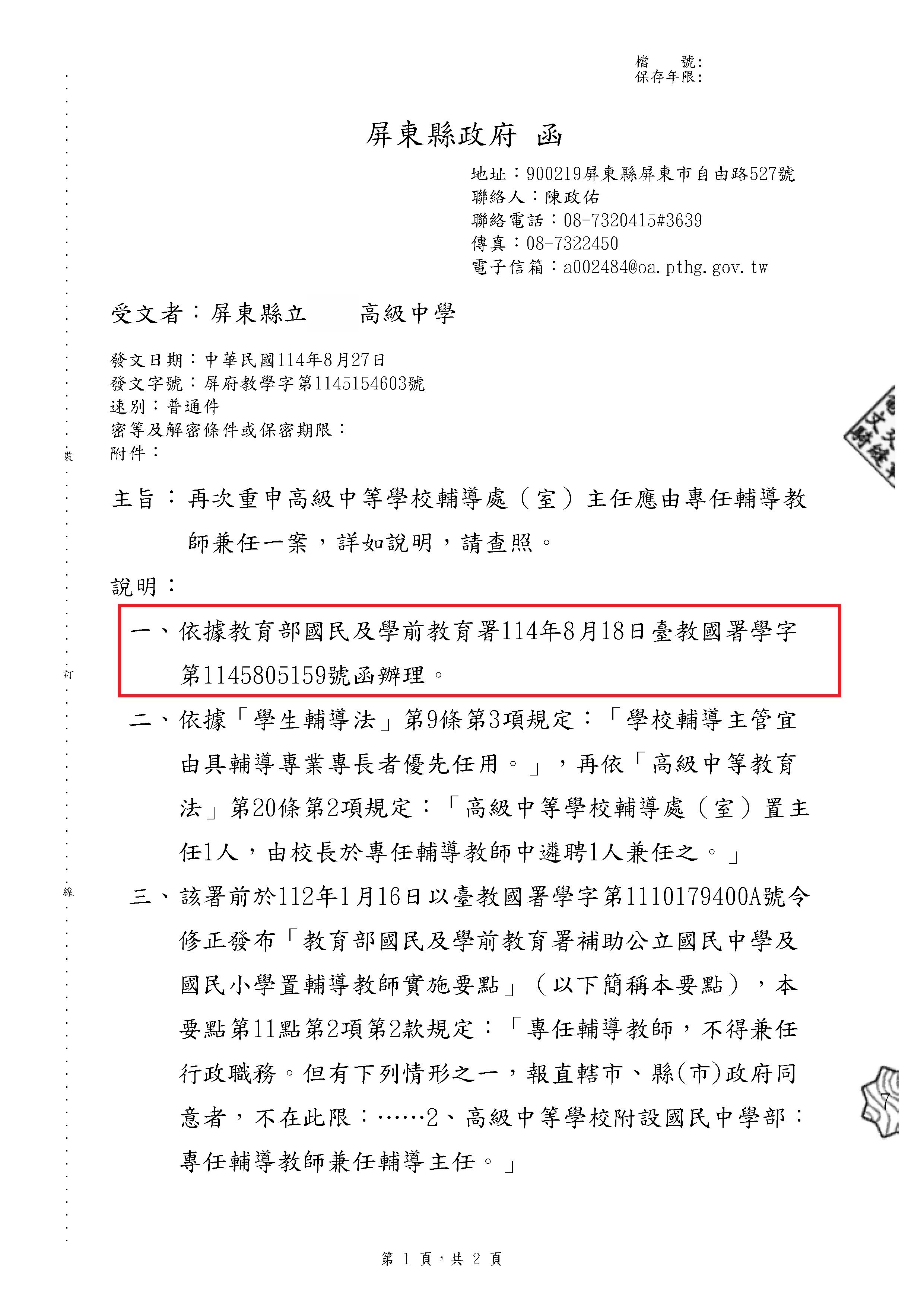 (一) 《高級中等教育法》第7條第3項:「依前二項規定所設之國民中學部及國民小學部,適用國民教育法之相關規定。」第20條第2項:「高級中等學校輔導處(室)置主任一人,由校長於專任輔導教師中遴聘一人兼任之。」