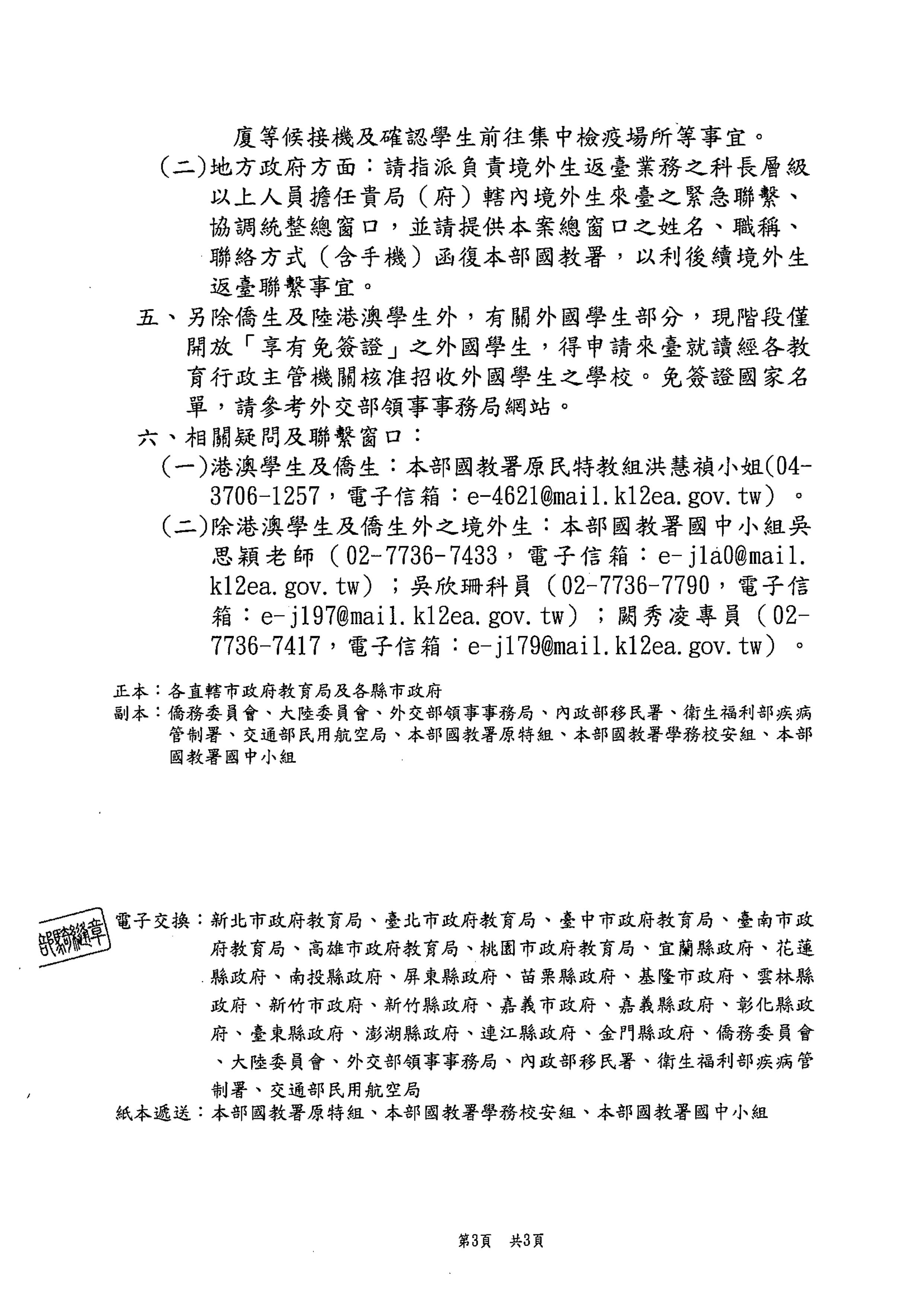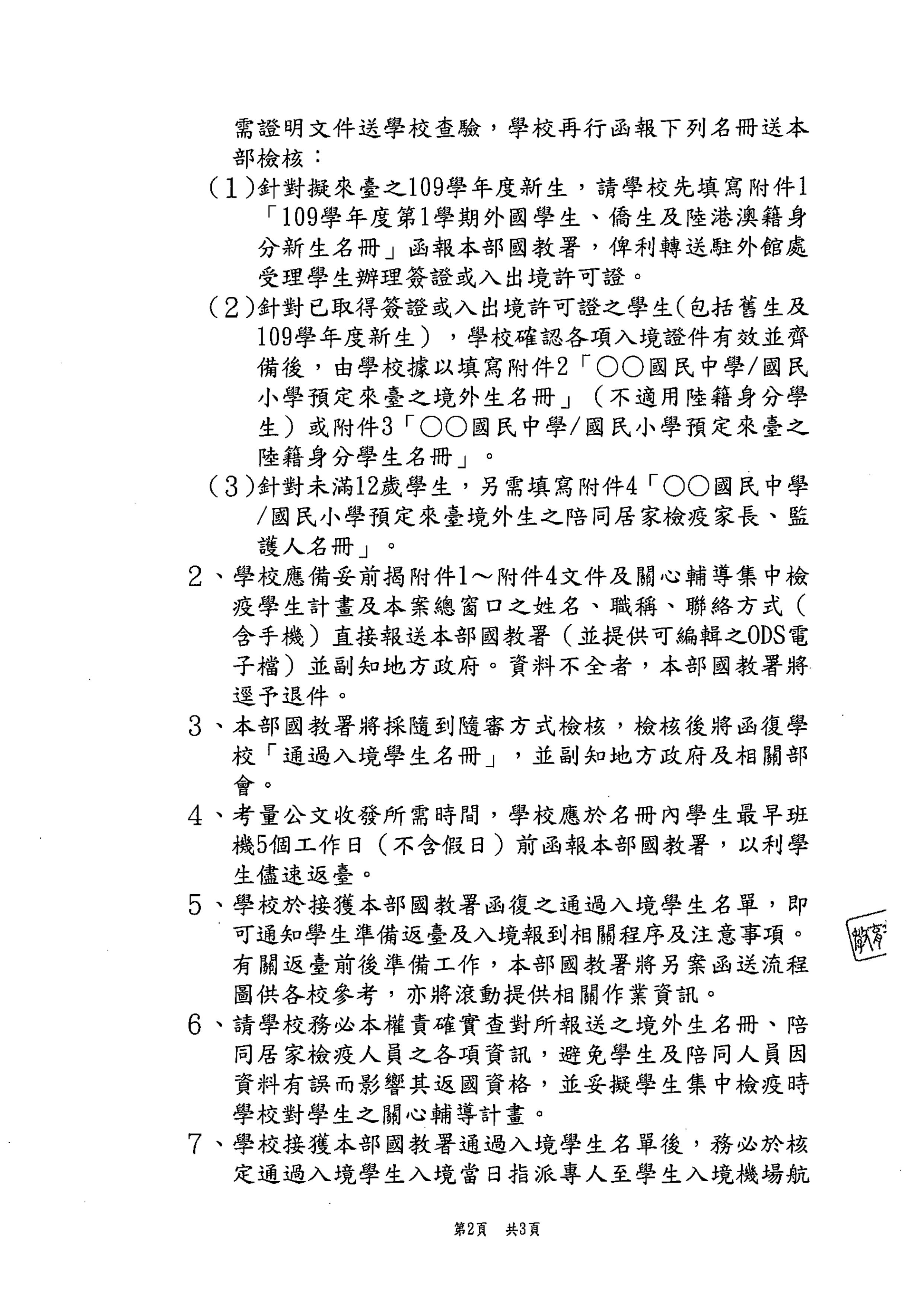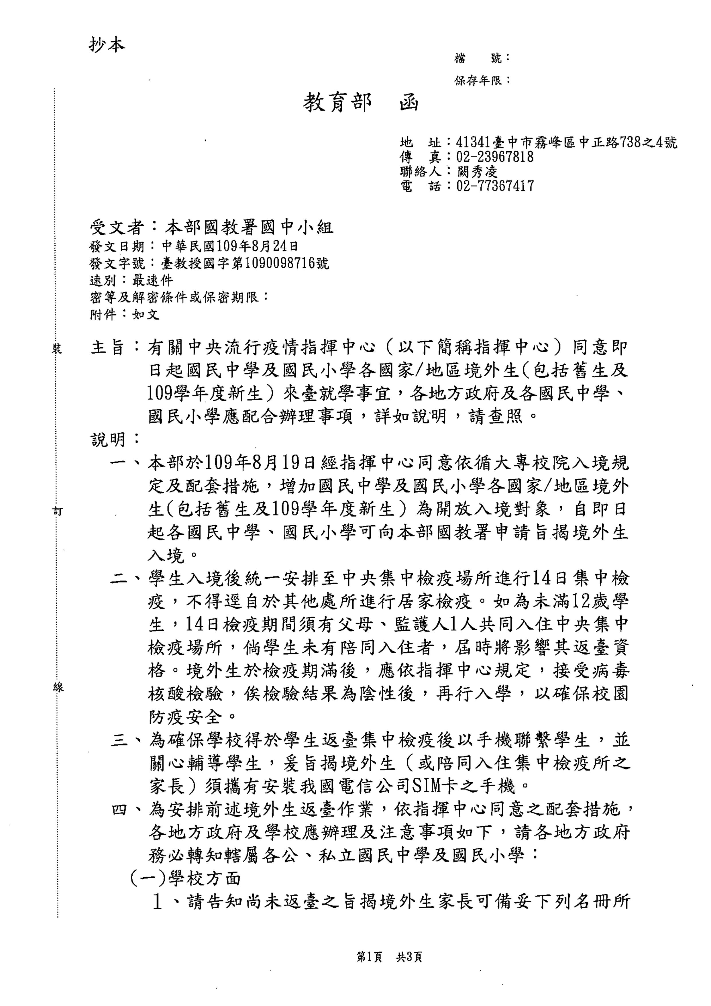 教育部於109年8月24日以臺教授國字第1090098716號函最速件,要求各國中、國小配合辦理境外生、陸生來臺就學相關事項。