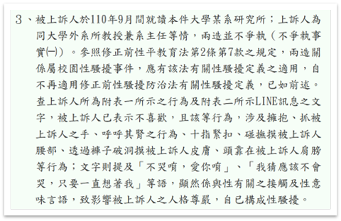 全教產經查閱臺灣高等法院臺南分院民事判決114年度上易字第99號判決書發現,國立嘉義大學體育與健康休閒學黃姓教授於110年10月中旬至112年3月9日指導研究生(下稱A女)論文期間,遭A女指控多次言語及肢體性騷擾,A女於112年3月30日向嘉義大學性別平等教育委員會(下稱性平會)提出性騷擾申訴,性平會於113 年4月12日認定黃姓教授對於A女之性騷擾行為成立,判決書所列之性騷擾事實計有:「不哭唷,愛你唷」、「想你,有沒有確診」、嘲笑A女將高「興」誤繕為高「性」,稱「你小小年紀就這樣喔」等言語性騷擾;及擁抱、把頭靠在A女肩上深呼吸,稱:「你好香」、「為什麼我抱完你,你身上會有香香的味道」、與A女面談時,對其十指緊扣之行為、有以手來回觸碰撫摸A女腰部,口稱「呼呼腎」之行為、A女有穿著破褲時,曾有以手指頭來回觸碰A女褲子破裂處之大腿、膝蓋皮膚之行為、有將頭部靠在A女肩膀上來回磨蹭之行為、曾有詢問A女與男朋友有無性經驗之行為、假藉慶祝名義擁抱A女之行為並稱「之後每完成一章我們就都擁抱一次」等肢體性騷擾行為事實;而且,當認定本件性騷擾行為時,黃姓教授對A女具有論文指導及評定之關係,並符合修正前性騷擾防治法(98年1月12日)第9條請求黃姓教授賠償其非財產上之損害於法有據。