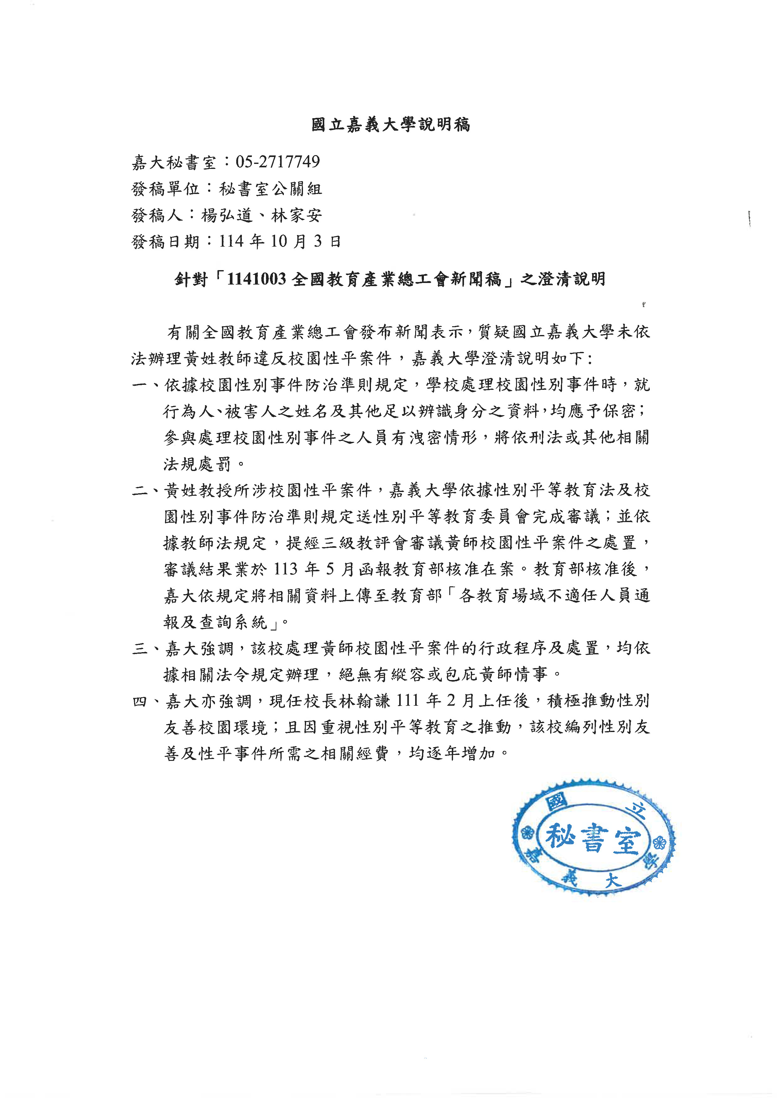 全教產嚴正呼籲教育部:要求國立嘉義大學應立即依法召開教評會審議解聘黃姓教授性騷擾案,以制度守護學生安全,而非姑息包庇,讓狼師流竄,保護學生學習環境的安全,才是教育部最重要的責任!