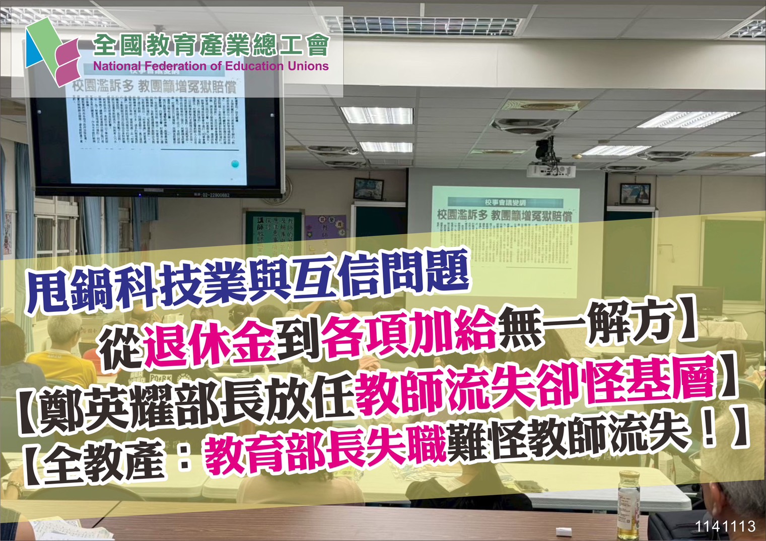 全國教育產業總工會(全教產)痛批,教師待遇停滯多年,從一個錯誤的退休金改革制度開始,不僅讓現職教師多繳少領延後退,嚴重侵害在職教師權益,政府的毀約背信,未足年提撥足額退撫基金,更造成退休教育人員延遲給付的薪資受損、尊嚴遭踐踏,到導師加給、特教加給、行政加給皆長期偏低且多年未調整,教育部始終未端出具體改善方案!全教產每年提出提高教師薪資與各項加給的訴求,教育部卻年年只以「研議中」、「造成地方政府財政困難」等卸責話語來搪塞,導致教師留任意願下降,本就是師資荒的主因之一。