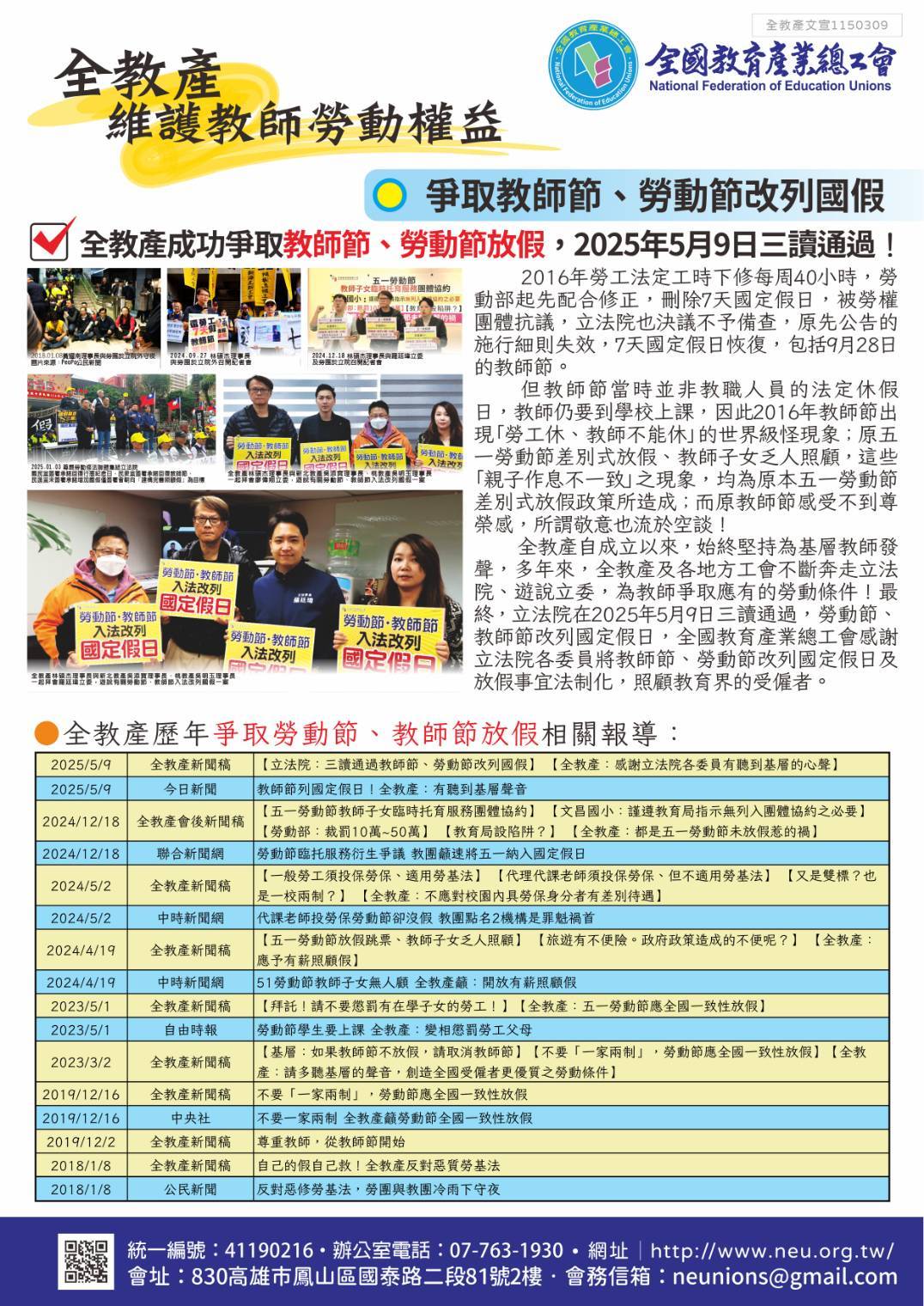 ★全教產成功爭取教師節、勞動節放假,2025年5月9日三讀通過!